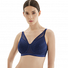 Поверх гладкой чашки, которая придает бюсту красивую округлую форму, проходит кружевное полотно с орнаментом в горошек, имитирующее бралетт. Завышенная линия декольте, высокая пройма и широкая спинка, которая у застежки становится выше, а также кружево, заходящее на бретели, скрывают возможные неровности и гарантируют безупречную посадку.